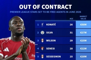 合同今夏到期英超球员身价排名:
