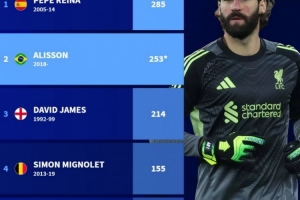 利物浦队史门将英超出场次数榜:雷纳285场居首,阿利松253场次席