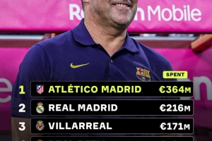 根据数据统计,弗里克上任后,巴萨引援花费仅为8800万欧,在西甲中位居第5位,落后于马竞(3.64亿欧)、皇马(2.16亿欧)、比利亚雷亚尔(1.71亿欧)以及贝蒂斯(1.01亿欧)。